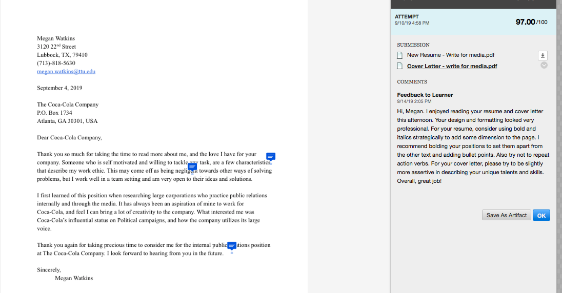 These assignments were beneficial because of their purpose in my future career. I got to cultivate a resume and cover letter, that have been now been edited to perfection. Provided above is a look at some of the major edits I made to my resume and cover letter. I look forward to using these two tools in the future. Above I have linked both copies of my resume and cover letter before and after edits. Enjoy!