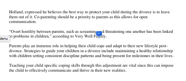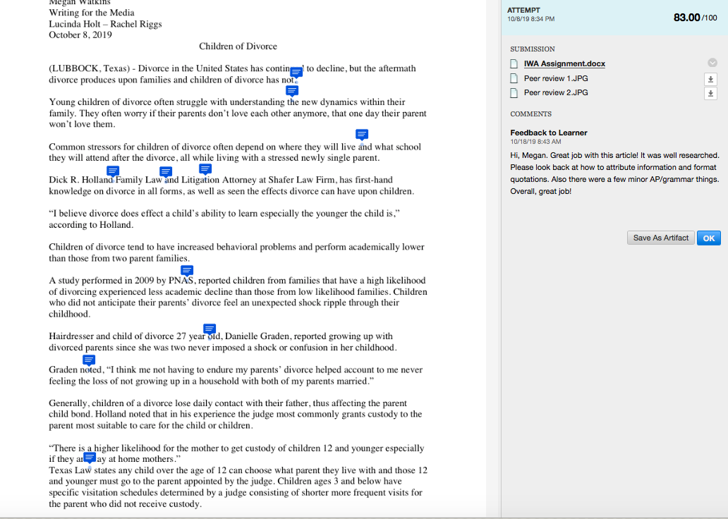 I enjoyed putting this paper together because of its personal ties. For this assignment we were given the opportunity to choose our topic, and write a news release style selection. I chose to cover children of divorce, and the repercussion’s of divorce. There were many edits to be made to this assignment, especially attribution. This assignment taught me what a news release looks like, as well as how to write one.