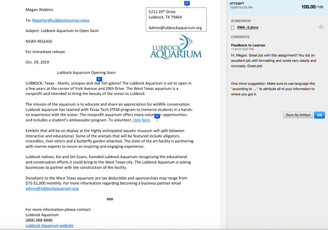 This assignment was to write a press release over an upcoming topic of your choice. I chose to cover the upcoming opening and construction of the Lubbock Aquarium. I enjoyed this assignment for its concise and simple format. This assignment let me have some fun and pick a newsworthy story myself. Linked above is my final press release and some notes made throughout the process.