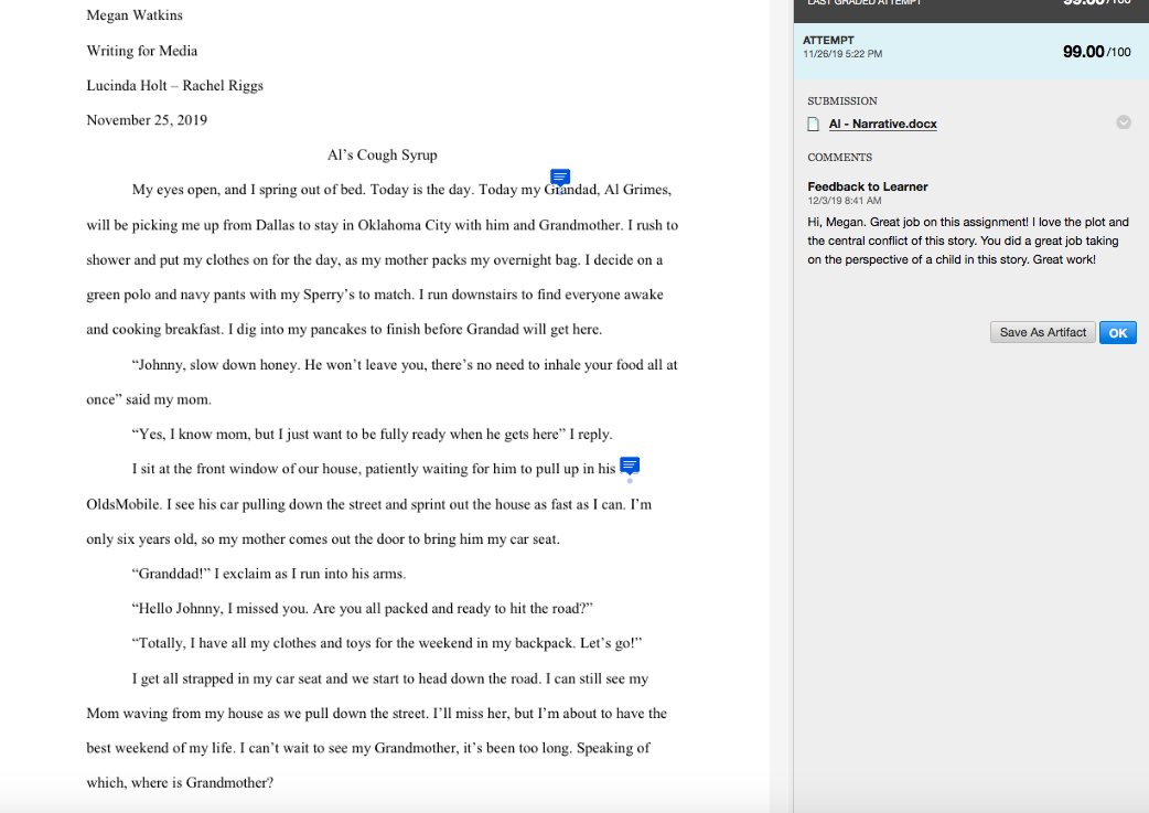 This assignment touched home as I chose to cover a family story about my grandad, Al. This assignment was to write a narrative over simply anything. I made a few edits from the comments linked above, such as a grammatical error. This story follows Al and his grandson Johnny on their drive to Oklahoma City. Some light hearted tattle-tailing made into a great narrative that I loved writing. Enjoy!